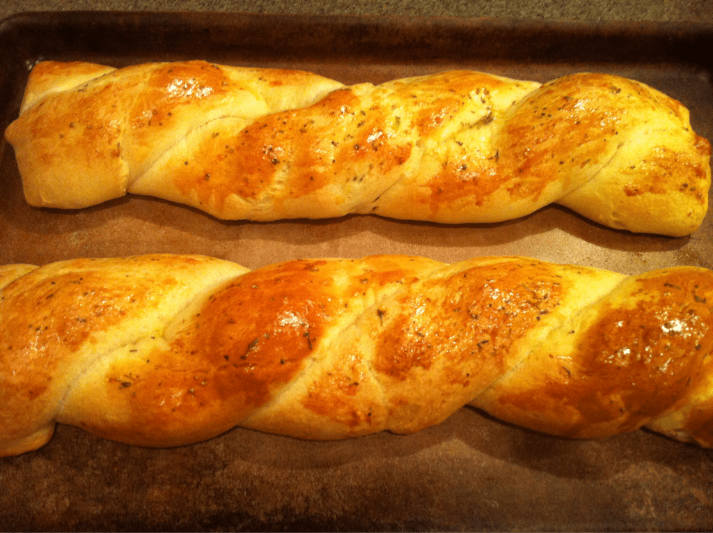 Dinner. Don’t let it fool you. It’s one of the easiest meals you’ll ever make. Proof: Step 1. Put 2 frozen chicken breasts in a crockpot. Add water. Set on high setting. Walk away for 6 hours. Step 2. Remove tender cooked chicken from crock, put in a medium bowl, mash to shred. Add seasonings. Tonight I used a little low fat mayo (can use cream cheese, sour cream or Greek yogurt), Italian seasoning, garlic, add green – I used bell pepper (can use spinach or broccoli). Step 3. Grab a couple of cans of croissants. Unroll. Split into 4 long rows. Press seams together. Fill with chicken mixture. Pull around and press seams. Roll seams to bottom side. Twist. Step 4. In a bowl, beat 1 whole egg with Italian seasoning. Brush onto braids. Step 5. Bake at 350 for 20-25 minutes or until golden brown. Step 6. Serve with a side salad. Step 7. Pretend like you spent ALL day cooking a gourmet dinner.