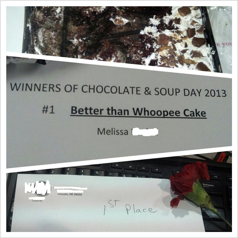 Today was the annual soup and Chocolate cook off at work. My contribution was ‘Better Than Sex (or Whoopee, as we’re being PC here!) Cake.