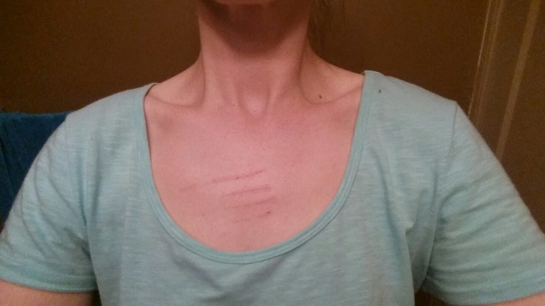 What really happened is this: I was helping my dad trim their mini dachshund’s nails when little Sophie (all 8.5 pounds of her!) freaked out and tried to climb on me, swiping my chest with her just-trimmed paw. She even drew blood! Thanks a lot Soph!