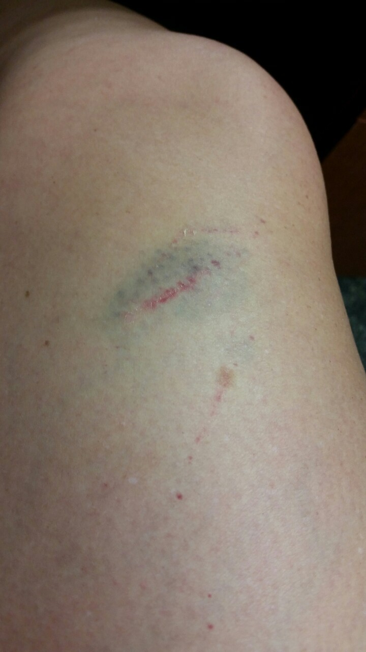 • My roomie’s dog will NOT STOP JUMPING on people. The above happened last night after he came in from outside and hadn’t seen me all day. She tells him to stop, but clearly, THAT’S not working. His sharp claws managed to not only scratch up my thigh but bruise me as well. I swear I spend half my life trying to figure out where the bruises on my body come from. I’ve currently got matching ones on the insides of my forearms that I’m curious about.
