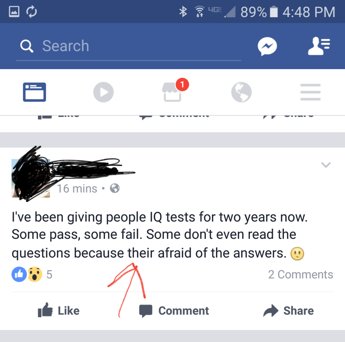 marathonmelissa Uncategorized March 22, 2017December 10, 2018 1 Minute From my Facebook feed today. You probably shouldn’t be so smug and then use the wrong form of they’re. 😒 Just sayin’. Share this: Share on X (Opens in new window) X Share on Facebook (Opens in new window) Facebook Like Loading... Related Published by marathonmelissa View all posts by marathonmelissa Published March 22, 2017December 10, 2018