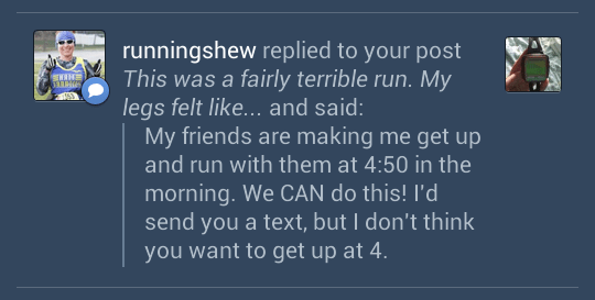 So that’s my dream. Not terribly exciting, but kind of strange…and then I woke up to a text from another Tumblr Amy…telling me to get out of bed and go run!